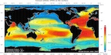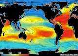 Go to this pageSea Surface TemperatureThe oceans of the world are heated at the surface by the sun, and this heating is uneven for many reasons. The Earth's axial rotation, revolution about the sun, and tilt all play a role, as do the wind-driven ocean surface currents. The first animation in this group shows the long-term average sea surface temperature, with red and yellow depicting warmer waters and blue depicting colder waters. The most obvious feature of this temperature map is the variation of the temperature by latitude, from the warm region along the equator to the cold regions near the poles. Another visible feature is the cooler regions just off the western coasts of North America, South America, and Africa. On these coasts, winds blow from land to ocean and push the warm water away from the coast, allowing cooler water to rise up from deeper in the ocean. ||